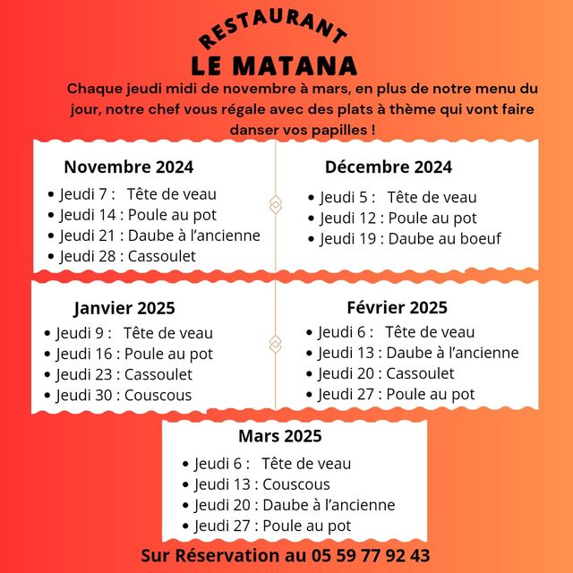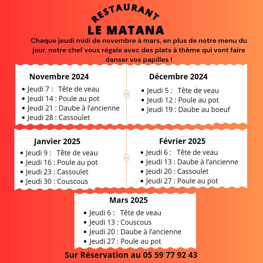 Tous les jeudis midis de octobre à mars 2025-2026, sur place ou à emporter, le Chef propose des plats typiques à la région ou bien des plats cuisinés d'autres régions.